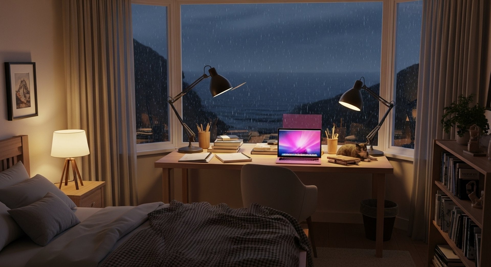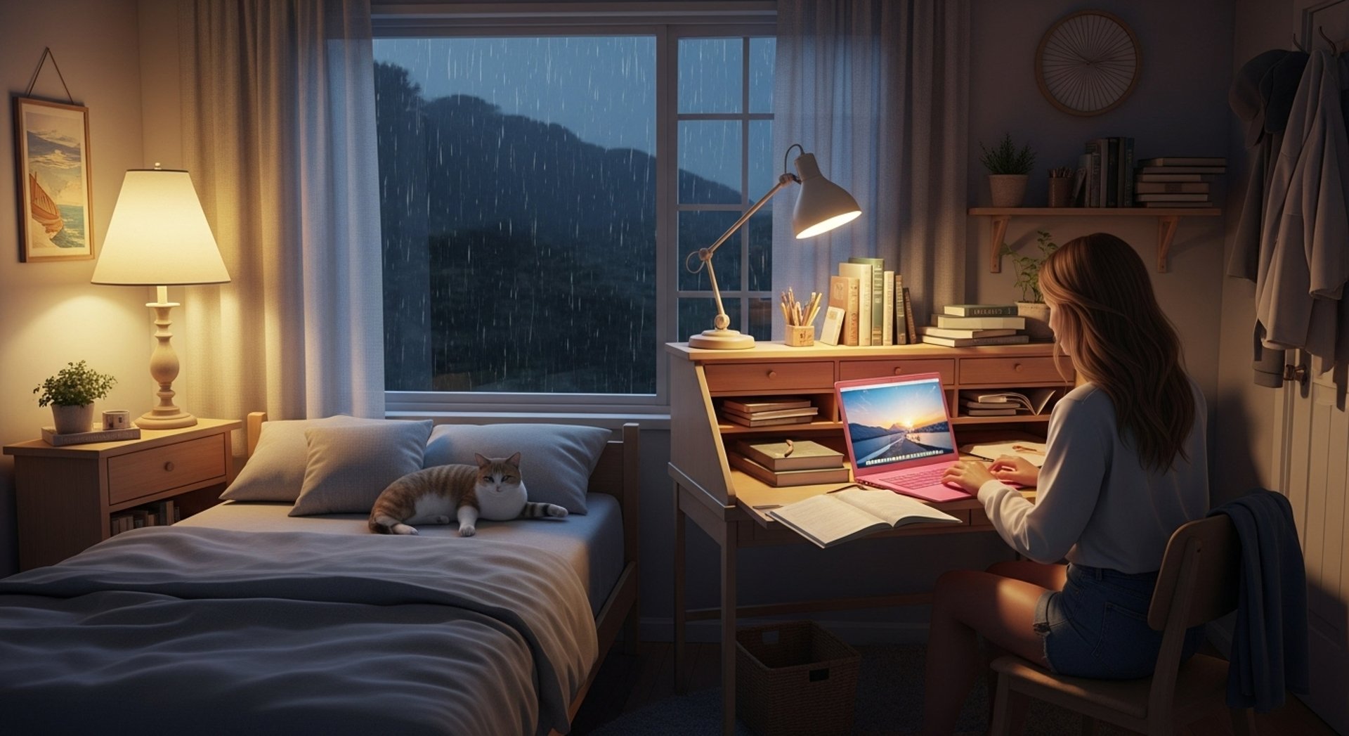 Find peace with visuals of rain on windows, perfect for studying or unwinding.